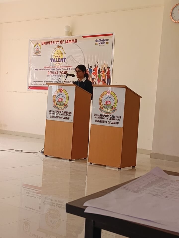 Students of our college represented the institution at the inter‑college cultural festival “Display Your Talent 2025 – Devika Zone” held at the Garnai Campus, University of Jammu. The poster presented by Aditi Devi on the theme “Viksit Bharat” effectively communicated and recognized for its creativity and clarity for which she got 2nd position. Kamakshi and Manyata demonstrated strong argumentative skills and teamwork, earning commendation from the adjudicators in the debate competition by getting 2nd position. The participation of Aditi Devi, Kamakshi, and Manyata has enhanced the college’s reputation in inter‑college cultural events. Their achievements reflect the vibrant talent pool within our institution and underscore the importance of continued support for extracurricular activities.
