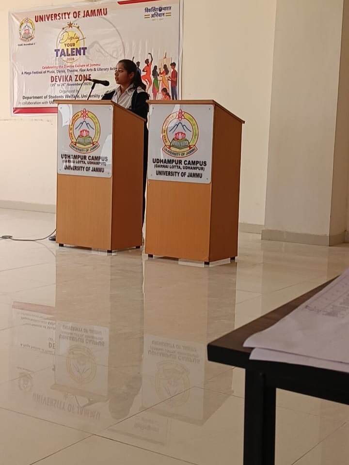 Students of our college represented the institution at the inter‑college cultural festival “Display Your Talent 2025 – Devika Zone” held at the Garnai Campus, University of Jammu. The poster presented by Aditi Devi on the theme “Viksit Bharat” effectively communicated and recognized for its creativity and clarity for which she got 2nd position. Kamakshi and Manyata demonstrated strong argumentative skills and teamwork, earning commendation from the adjudicators in the debate competition by getting 2nd position. The participation of Aditi Devi, Kamakshi, and Manyata has enhanced the college’s reputation in inter‑college cultural events. Their achievements reflect the vibrant talent pool within our institution and underscore the importance of continued support for extracurricular activities.