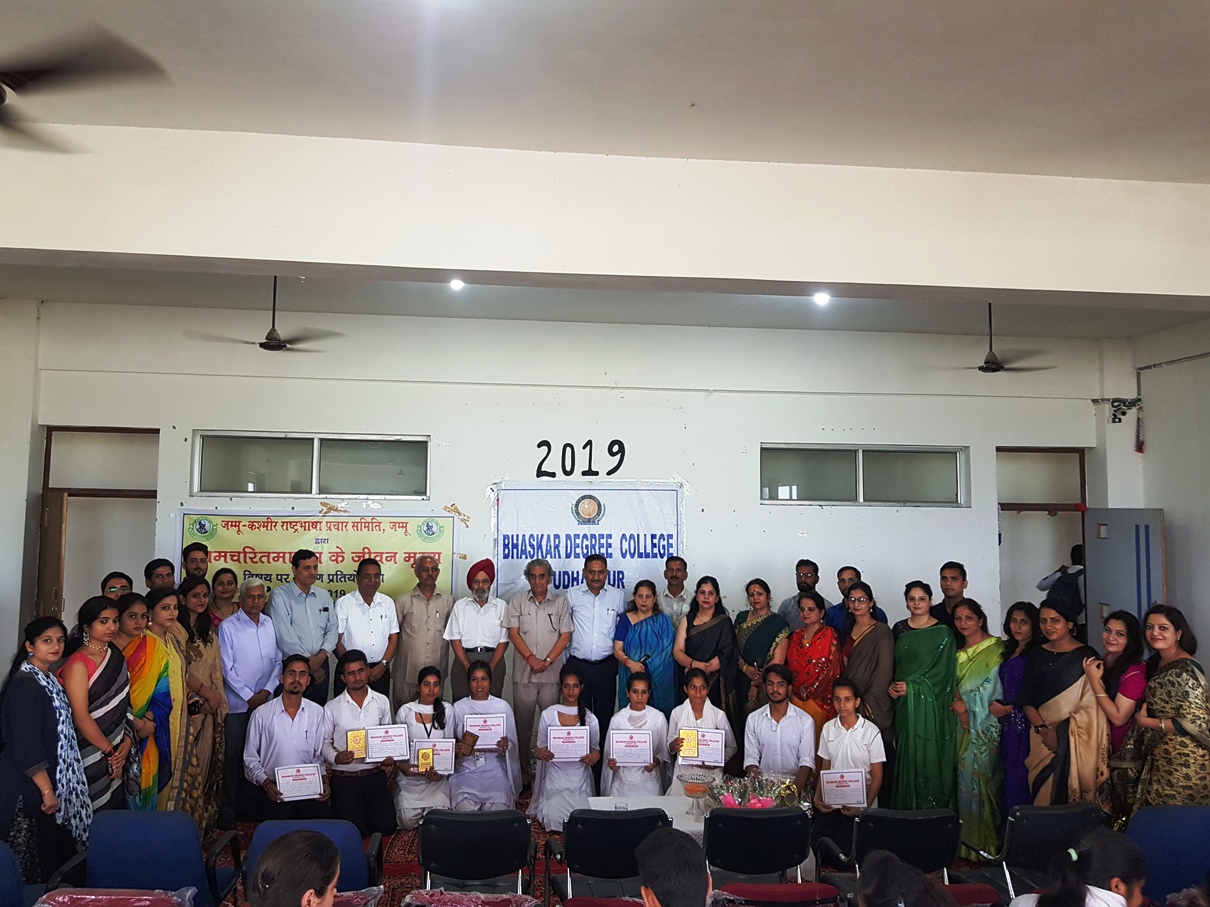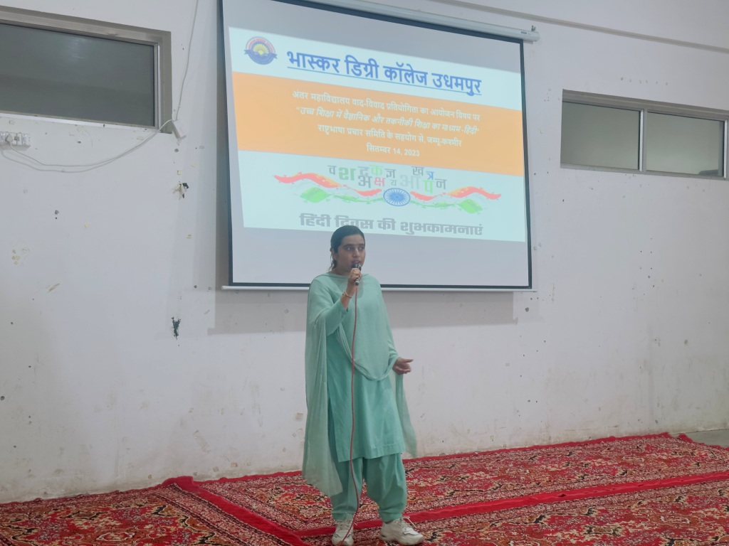 To celebrate the India adopted Hindi as its Official language “Bhaskar Degree College Udhampur observed “Hindi Diwas” today with great fervor and enthusiasm. To draw attention to the importance of Hindi “Matra Bhasha” students from different colleges participated in debate competitions organized by the Department of Hindi, Bhaskar Degree College in collaboration with Jammu and Kashmir Language Propagation Committee. Dr. Bharat Bhushan Sharma was the organizer and the Chief Guest was eminent Dogri writer Padmashri Retd. Prof. Sh.Shiv Dutt Nirmohi Ji. Hindi Bhasha Diwas commenced with the traditional ceremony of lightening of lamps. Dr. Pankaj Sharma GDC Boys Udhampur, Dr. Vijay Verma and Prof. Rakesh Thakur were the judges of the event.