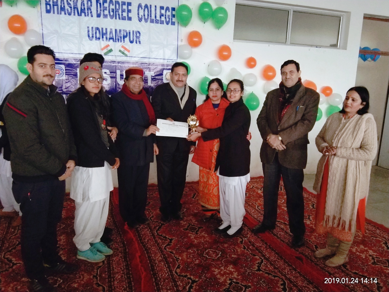 Organizing Educational Tour is one of the healthy practices of our College. In this context an Educational Tour was organized by Bhaskar Degree College Udhampur w.e.f. 24th Feb, 2020 to 1st March, 2020. 35 students (boys/girls) accompanied by three staff members en-route the tour visiting Delhi, Jaipur, Ajmer Shraiff, Pushkar and back. Students and staff enjoyed the tour with great enthusiasm and jovial feelings along with educational historical exposure. The Tour has put an indelible mark in the minds of young hearts which will put them on pedestals of great synergy and overall development of their personality. Students of the College participated in Economic Fest ARTHA 2020 w.e.f. 7th Feb, 2020 to 9th Feb, 2020 at SMVDU. "Sports Festival at Govt. Degree College Udhampur Bhaskar Degree College Udhampur paid tributes to the martyrs on 14th Feb, 2020 after completion of one year of their martyrdom. One of the student of Sem -VI Janu Partap Singh read out the heartfelt message and the students observed 2 minutes of silence in the memory of the brave hearts who laid down their life for the Unity and Integrity of the Country. Jai Hind. "The students of Bhaskar Degree College, Udhampur participated in "Beti Bachao Beti Padao" programme organised by District Administration in collaboration with ICDS Udhampur held at Sher-E-Kashmir Police Training Academy, Udhampur on 05-Feb-2020. Eight students along with Prof. Hema and Prof. Pooja participated in the programme. The college was honored by the memento present to it by the District Administration Udhampur. "Basant Panchami celebrated with great fervour and enthusiasm at Bhaskar Degree College Udhampur. Colourful, cultural programme performed by the students and graced by the students, Principals of Bhaskar Degree College Udhampur, Bhartiya College of Education Udhampur and Bhaskar Institute of Paramedical Sciences Udhampur and staff- 30 Jan, 2020" Bhartiya Group of College Udhampur Viz Bhaskar Degree College Udhampur, Bhartiya College of Education Udhampur & Bhaskar Institute of Paramedical Sciences Udhampur celebrated 71st Republic day with great enthusiasm and fervour . Students of the College on Environmental Field Study at Dhanuka Industries Battal Ballian as the part of their Project Work-7th Nov, 2019 Bhaskar Degree College Students on picnic to Mansar on 5th Nov, 2019 Bhaskar Degree College celebrate and organised Debate competition on Hindi Diwas-16th Sept, 2019 Election of the student council was held on 7th of Sept, 2019 in which twelve counsellor, four each from BA/B.Com Sem-I, III and V were elected. In which Mr. Jasveer Singh of B.Com Sem-V elected as Head Counsellor and Ms. Sushani of BA Sem-V, Mr. Abishek of BA Sem-III and Mr. Suraj Bhan of BA Sem-I elected as cabinet counsellor. Teachers Day Celebration 2019 Bhaskar Degree College conducted rally on "Ban on plastic" and "Solid Waste management" in collaboration with District Legal Services Authority Udhampur to aware the general public on the ill-effects of Plastic on our environment-3rd Sept, 2019. An inter- college seminar was organized in collaboration with J&K National Language Propagation Committee on the Topic“Relevance and Utility of Ramcharitmanas in present scenario” -30th Aug, 2019. The Chief guest of the event was Prof.Shiv Nirmohi ji, the famous Hindi writer as well as recipient of Sahitya Academy Award whereas Sardar Dedar Singh chairman of J&K National Language Propagation Committee was the guest of honour