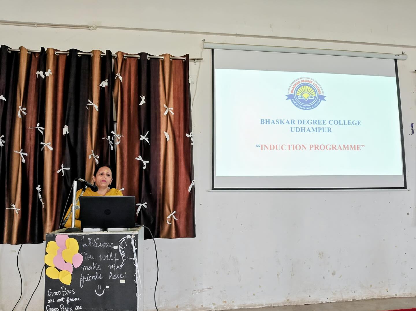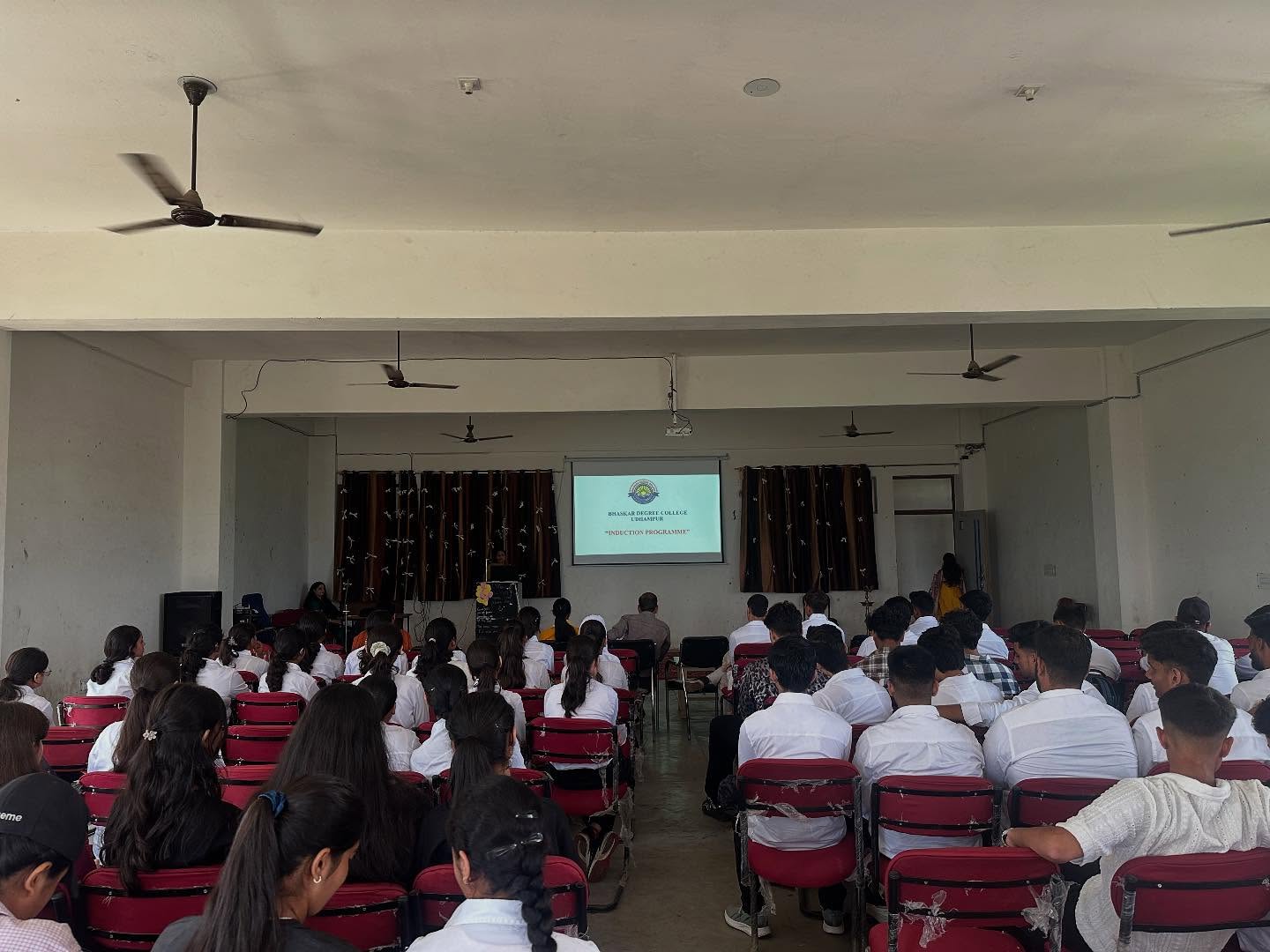 Induction Programme organized in the Bhaskar Degree College Udhampur on 8th September 2022 in Multipurpose Hall. This programme was started with lighting of lamp by Ashok Khajuria, MD of the Bhartiya Group of Institution, Prof. Bindu Salaria Vice- Principal, Prof. Vijeta, and Prof. Hema Dutt. The programme commenced with the interaction of Ashok Khajuria with the students.Virtual visit of college was shown to students. In the virtual visit, teacher's shared necessary information regarding the facilities, events and discipline of college with students.