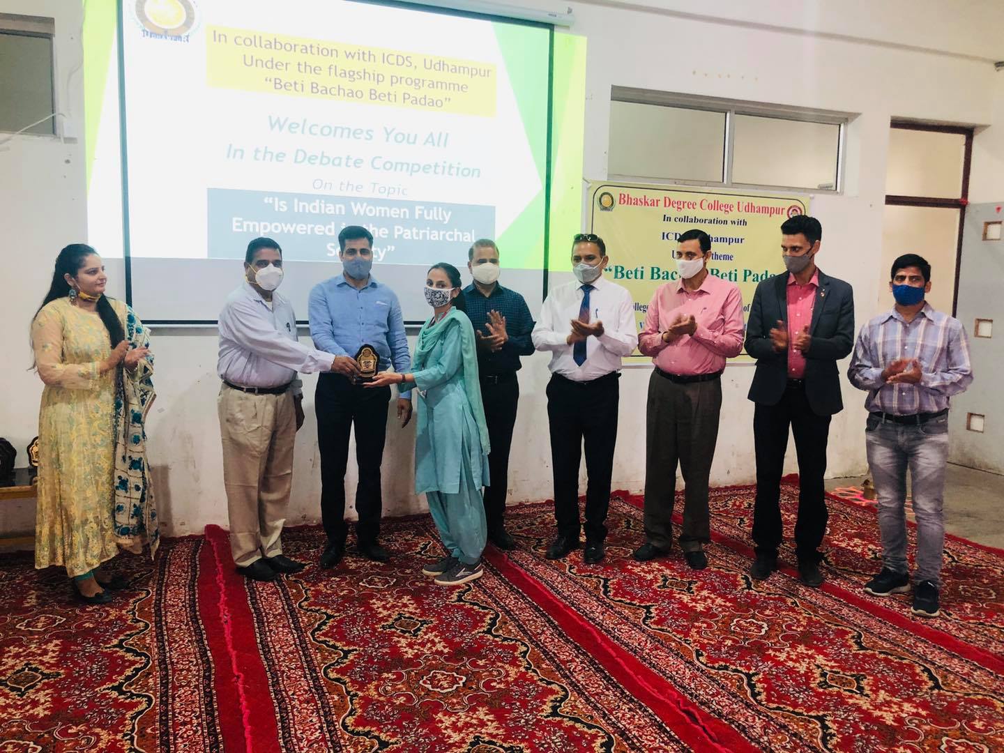 The programme was further followed by the students' dance performance. Along with this, Prof. Bindu Salaria and Prof. Silky Gupta presented a power-point presentation to brief the students about the college activities, achievements, syllabus, courses and other co-curricular activities. The whole event was anchored by Prof Hema Dutt. And the vote of thanks was offered by Prof. Bindu Salaria. Bhartiya Group of Colleges celebrates India’s 75th Independence Day in its campus To inculcate the awareness about the harmful effects of Tobacco, Bhaskar Degree College, Udhampur under the guidelines of University Grant Commission organise pledge taking ceremony along with the students on World No Tobacco Day with the theme 'Commit to Quit' on 31st May, 2021. 30 March, 2021: Bhaskar Degree College Udhampur organized an inter-college debate competition on the topic “Is Indian woman fully empowered in the patriarchal society?” in collaboration with ICDS Udhampur under the flagship programme “Beti bachao beti padao” in the college premises. The event was commenced with the lighting of lamp by the worthy chairperson of the college Mrs Madhu Khajuria, principal of the college Dr. S.K. Magotra, Dr. Anita Bali, principal Bhartiya College of Education, Dr. B.L. Raina, HoD M.Ed dept, Prof P.L. Suri and Dr. Pankaj Sharma from GDC Udhampur. Besides them, co-hosts of the event Mr. Yashpaul Sharma CDPO, ICDS Udhampur and Mr. Sanjeev Sharma CDPO, ICDS Ghordi and managing director of the college Mr. Ashok Khajuria was also present. The further proceedings were carried on by Prof. Bindu Salaria, in which she threw light upon the dire need of women empowerment in our society. The principal of the college addressed the gathering and the participants with his welcome speech. Ample of colleges had participated in the debate competition including GDC Udhampur, GDC Ramnagar, and Bhartiya College of education Udhampur. Participants participated with full zeal and enthusiasm and presented their views in front of all by speaking against and in the favor of the motion. The event was judged by the jury panel which included: -Dr. Pankaj Sharma, Prof. Joginder Singh and Prof. Pinaki Bakshi. The first prize was grabbed by Akshita Sharma of BDC Udhampur, second by Charvi Kalsotra of GDC Udhampur and third by Unzila Jan of BDC Udhampur. All the rest participants were felicitated with consolation prizes and certificates of participation. The entire programme was compered by students of B.A. Sem III Akshita Sharma and co-ordinated by Prof. Hema Dutt.