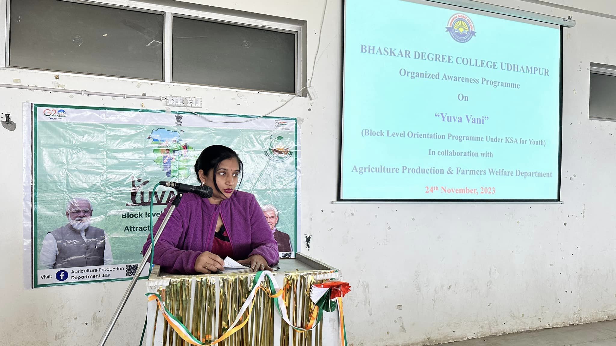 24th Nov, 2023: Bhaskar Degree College Udhampur organized an awareness program on “ Yuva Vani” Skill Development Programme in collaboration with Agriculture Production & Farmers Welfare Department J&K.